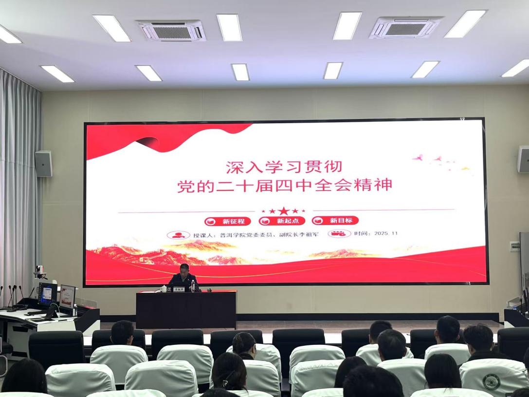 2025年11月21日下午,普洱学院党委委员、副校长李祖军以“深入学习贯彻党的二十届四中全会精神”为题,为人文、理工、外语、经管学院的80名师生党员代表讲授了一堂主题鲜明、内容翔实的专题党课。党课紧扣全会精神内核,结合学校“十四五”发展成果与“十五五”规划蓝图,引发全场师生强烈共鸣。